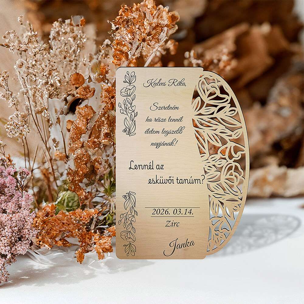 Teljesen személyre szabható esküvői tanú felkérő fára gravírozva.